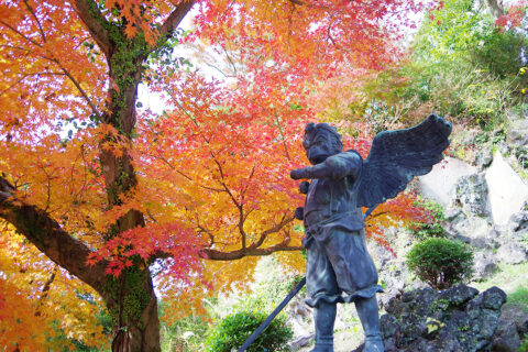 三門(山門)から最も奥の半僧坊へ向かう高低差のある参道を進むと、赤黄緑が美しい立体的な紅葉が楽しめる。石段を上りきった半僧坊からは建長寺の全景が見晴らせ、遠くには由比ヶ浜を望む絶景が広がる。赤く色づいたもみじに天狗像が映えるショットを残すことも!