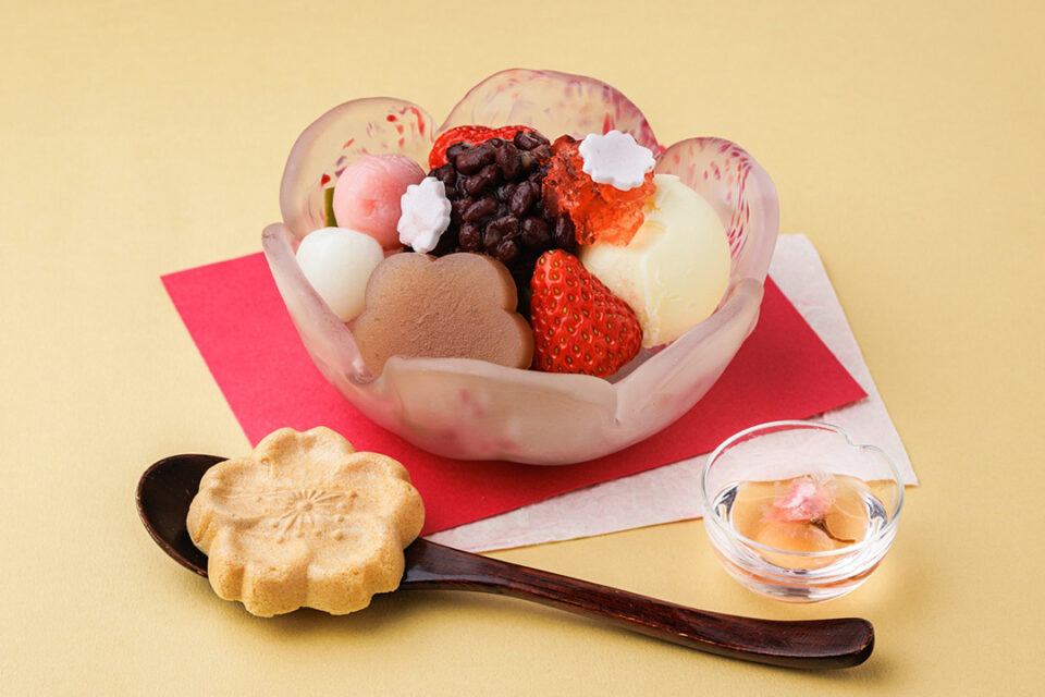 定番あんみつに桜羊羹、桜葉入りミルクジェラート、リンゴジュレ、桜の形の最中を添えた春限定の一品。桜茶を思わせる、桜の葉と花を漬け込んだ特製シロップをかければ、華やかな香りと上品な甘さが口に広がる。