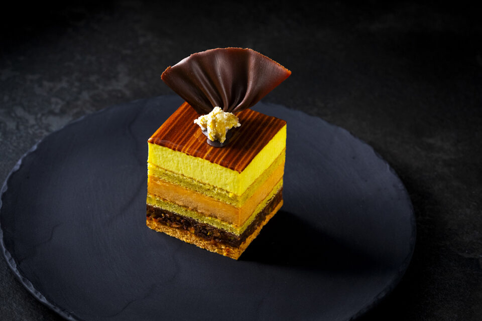 ピスタチオとアーモンドを組み合わせた、シックで凛とした美しさが際立つスイーツ。最高級シシリー産ピスタチオを贅沢に使用したこだわりの一品で、ナッツ特有の香ばしさとガナッシュクリームのコクが楽しめる。主役のピスタチオは、ババロワだけでなく、ビスキュイやヌガーなどシェフの技巧により多彩な表情を見せ、濃厚なナッツの味わいと絶妙なハーモニーを奏でている。くちどけ滑らかな 2種類のババロワの中に、ヌガーやクラッツランなどのカリっとした食感がアクセントに。7つの繊細な層一つひとつに思いが込められた、ペストリーシェフ・生野剛哉 渾身のスペシャリテ「シシリアン」をこの機会に。