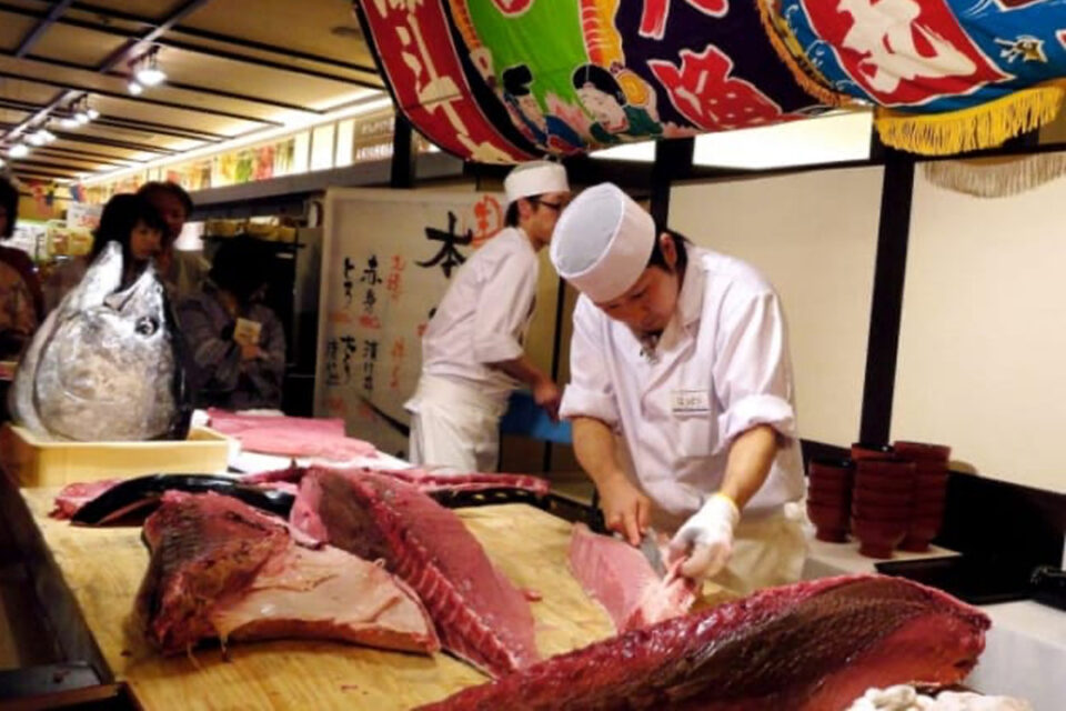 ※解体ショーのあとは、お寿司・お刺身・丼などの実演販売で、さばき立ての鮪を提供。