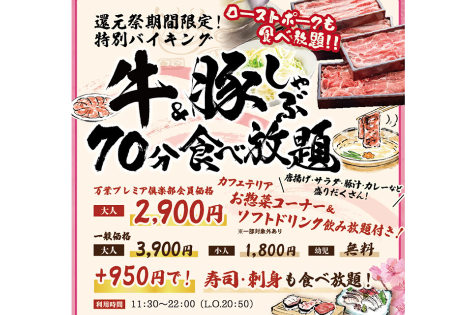 還元祭開催期間限定の特別バイキング。温泉でリフレッシュした後は、おいしいしゃぶしゃぶを堪能しよう!カフェテリアのお惣菜コーナー&ソフトドリンク飲み放題付き!