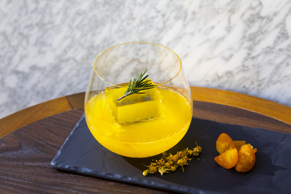 甘酸っぱい金柑とジンジャーを合わせた爽やかなカクテル。口あたりが良く、ほんのり香るカモミールが上品な一杯。