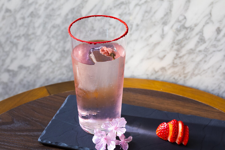 麦焼酎の澄んだ味わいに、桜の香りがふわりと寄り添う春のロングカクテル。塩漬けの桜の花が優しい塩味と香りを添え、ドライイチゴのリムが酸味と彩りをプラス。焼酎と桜が織りなす「余韻」が春風のような一杯。
