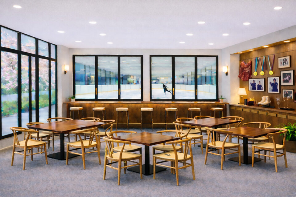 広い店内には浅田真央さんの現役時代の衣装やメダル、トロフィー、スケート靴などを展示するギャラリースペースも。さらに個室の窓からはサブリンクが見えるなど、スケートリンクならではの開放的な空間になっている。ランチやディナー、散歩途中の休憩など、さまざまなシーンで利用してみては。