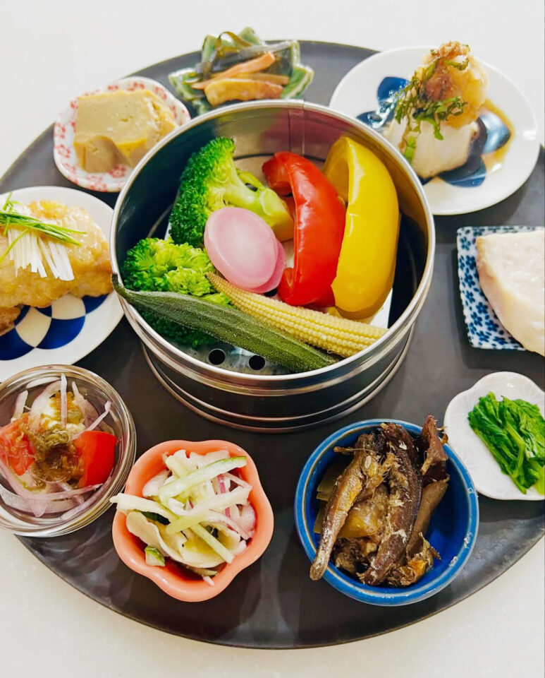 丸いプレートにちりばめた副菜の数々は目にも鮮やかな季節の御膳。彩り鮮やかな味わいで心も身体も充たされて!