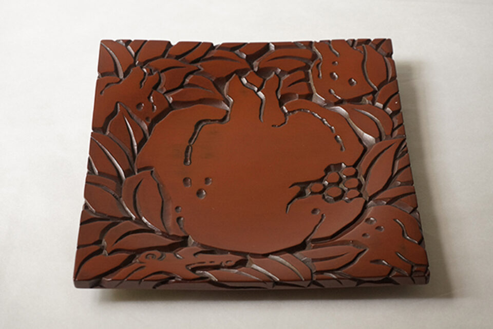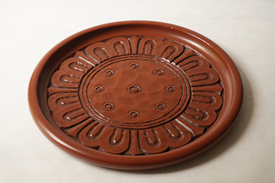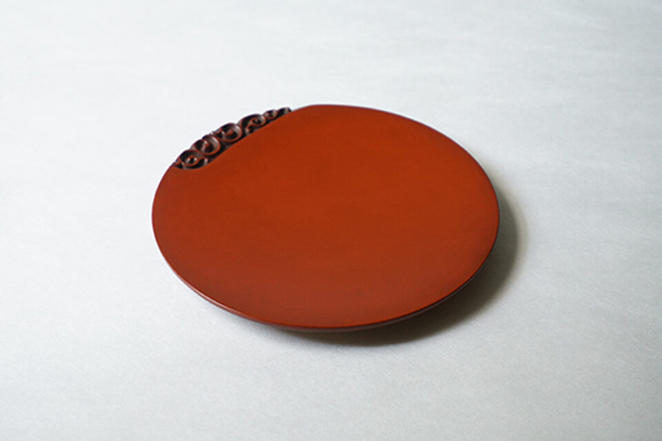 蓮の花をモチーフとした屋根瓦に由来した文様。全体に刀痕があしらわれ、使いこむほどに刀痕の山に中塗り漆の黒が現れるので、増していく味わいを楽しめる。