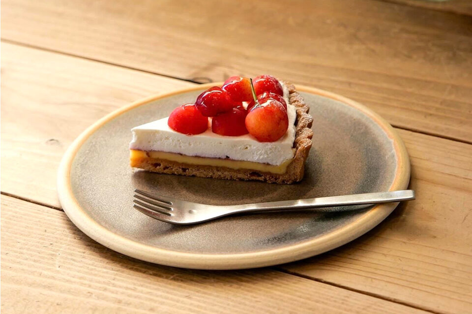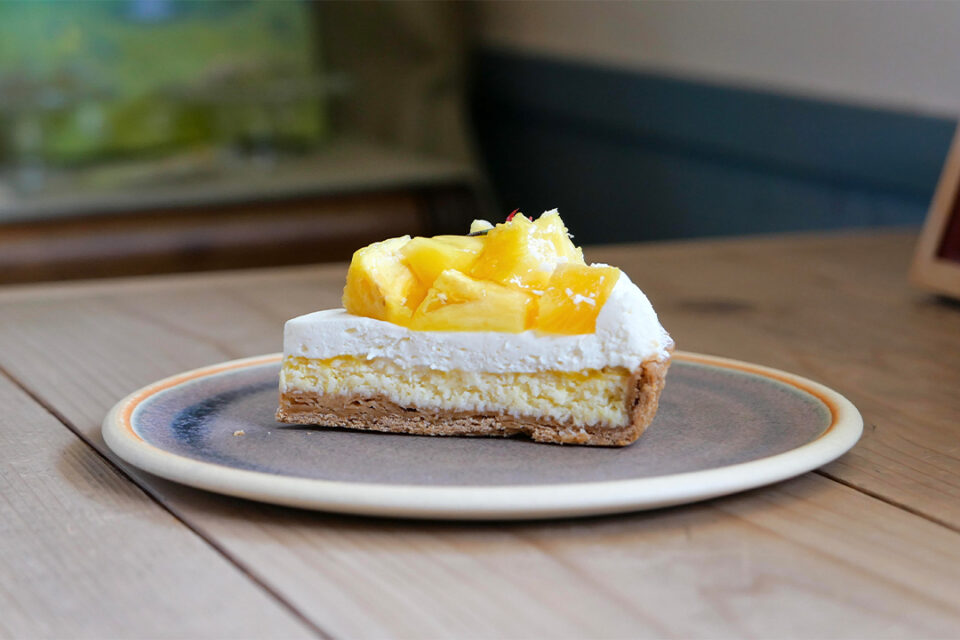 ―「菓子 巡り」さんのケーキと、「WEEKEND」さんの焼菓子(すべてプラントベース)も取り揃える。
