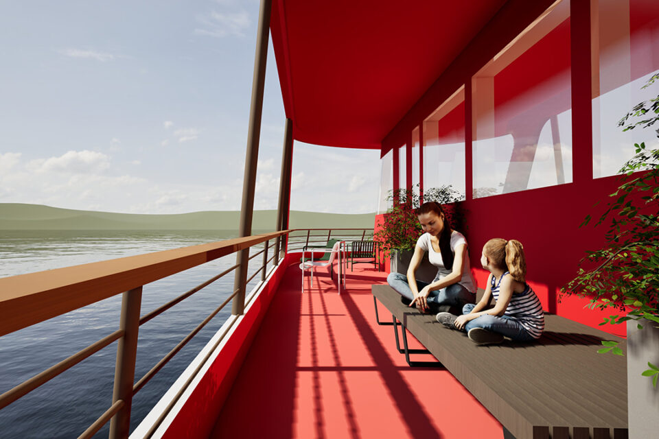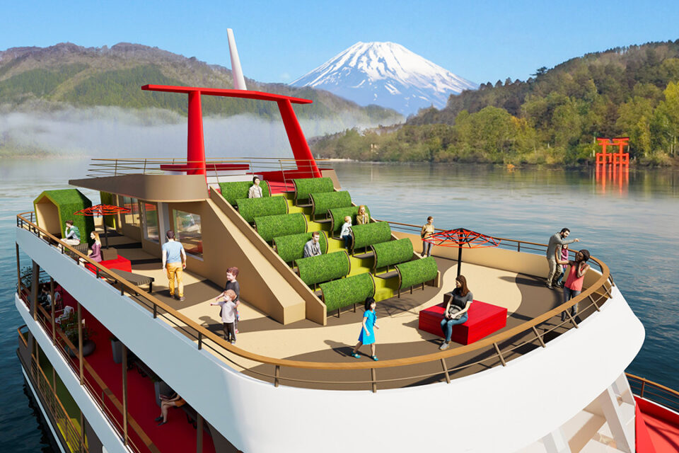 茶畑に見立てた船首側「3階屋外デッキ」では、段々畑のようなベンチに腰掛けて壮大な芦ノ湖・富士山を望むことができる!さらに、茶室・緑風庵も備わる「3階屋外デッキ・船尾側」や鮮やかな赤を基調にした「2階屋外デッキ」もあるので、全方向の景色を楽しみながら巡ってみては!