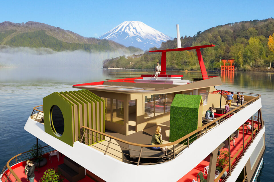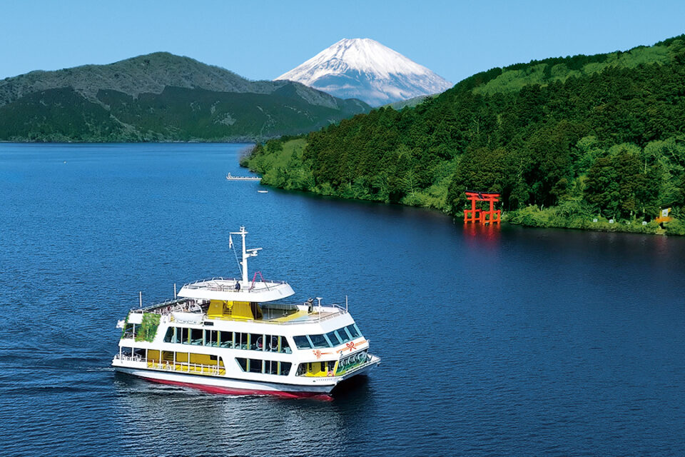 “箱根・芦ノ湖に浮かぶ緑の公園”というコンセプトで生まれた遊覧船。屋外デッキ、船内ともに、乗るだけでワクワクする仕掛けがいっぱい! 富士山や雄大な自然、箱根神社の平和の鳥居が織り成す風景に映える「箱根遊船 SORAKAZE」に乗って、空と風と一体になろう!