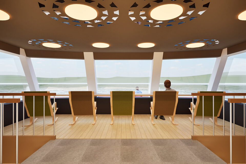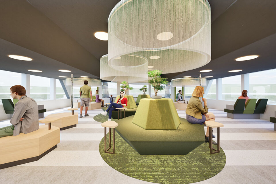 靴を脱いでくつろげるキッズスペースからは、大きな窓越しに操舵室を見ることができ、船旅のワクワク感も最高潮に!さらに、小上がりスペースや、ゆりかごチェア、赤富士をイメージしたソファ席、湖を眺めながらゆっくり過ごせるカウンター席など多種多様な席が備わる!気になった席で、思い思いの時間を楽しもう!