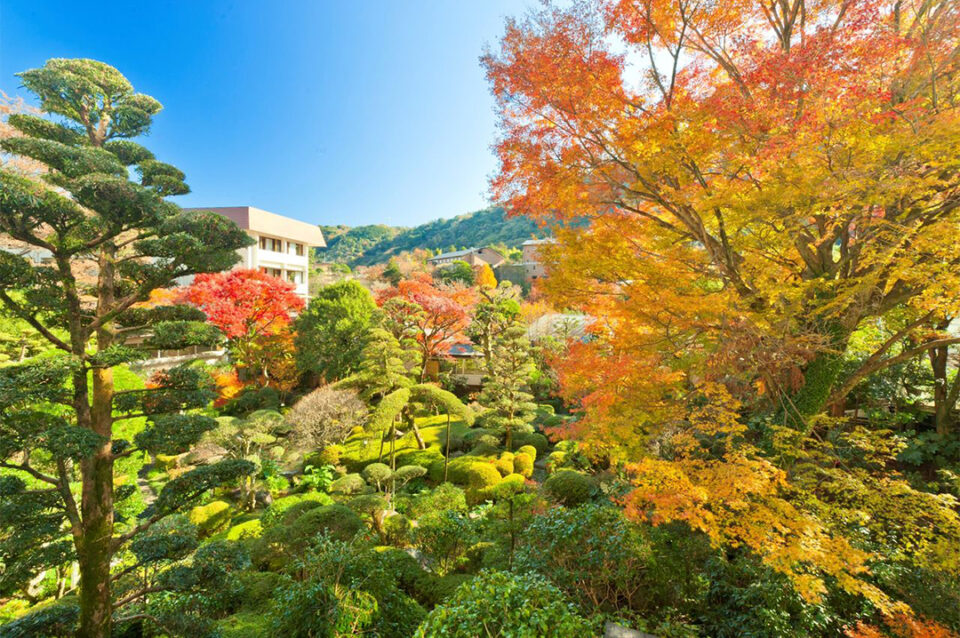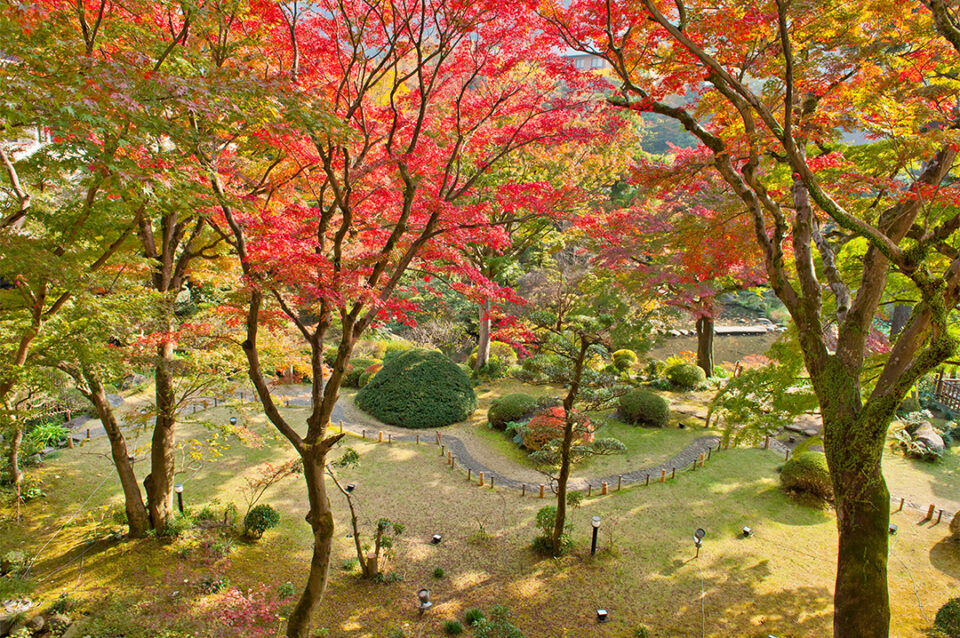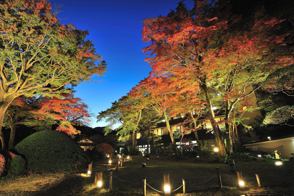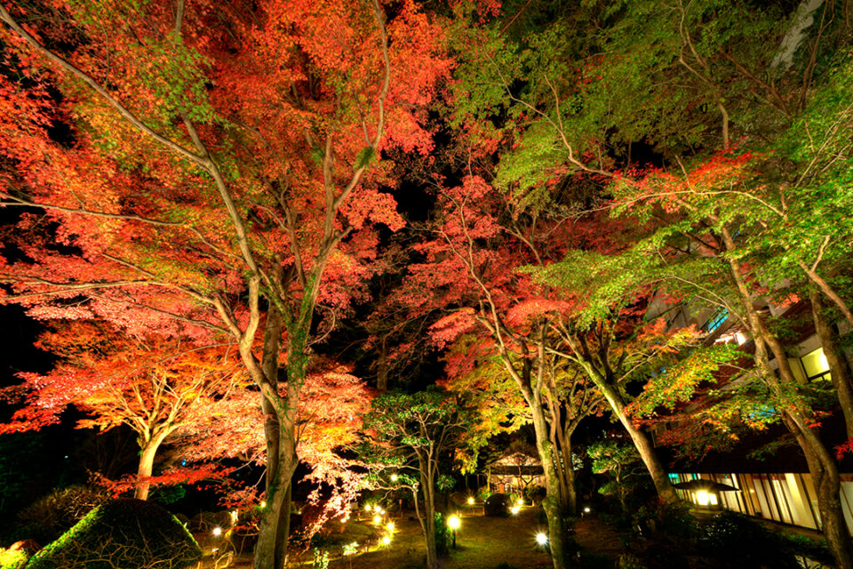 吉池旅館の池泉回遊式庭園「山月園」では、10月11日(土)~12月24日(水)まで紅葉の夜間ライトアップを開催。闇夜に浮かび上がる鮮やかな紅葉と幻想的な光の競演を、しっとりと味わう非日常の時間を過ごしてみては。