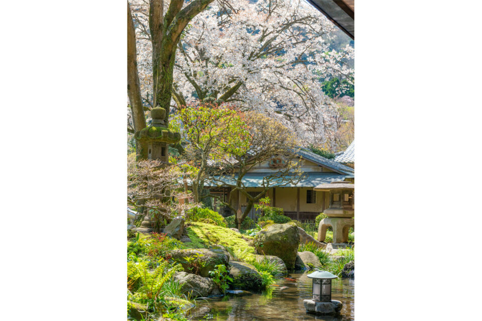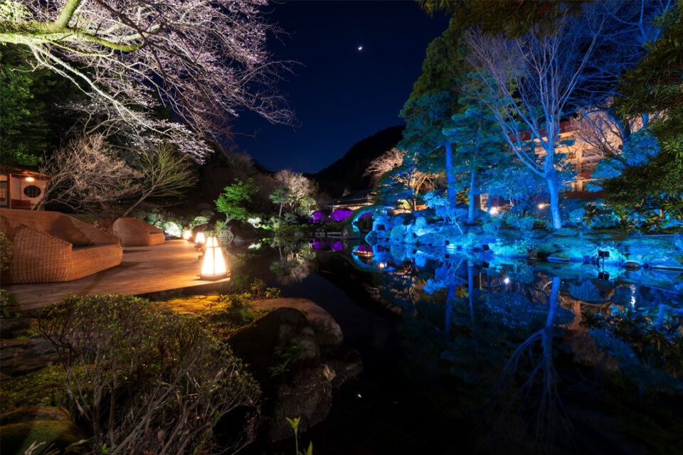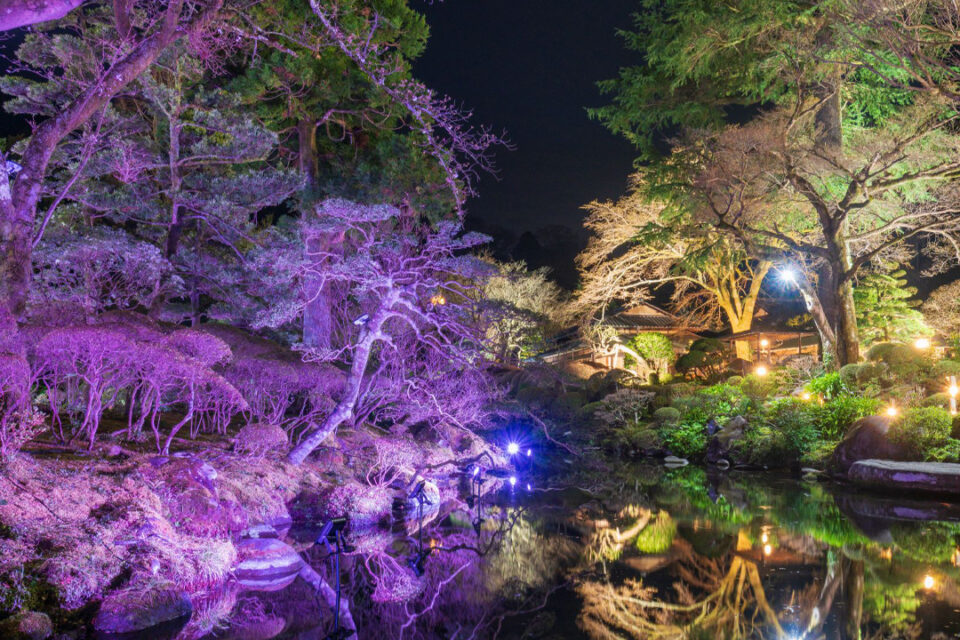 吉池旅館の池泉回遊式庭園「山月園」では、2026年3月21日(土)~4月12日(日)まで桜の夜間ライトアップを開催。闇夜に浮かび上がる鮮やかな桜と幻想的な光の競演を、しっとりと味わう非日常の時間を過ごしてみては。
