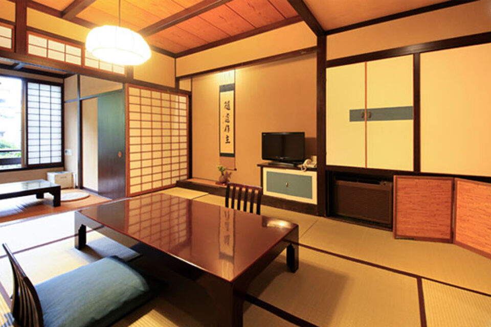 10畳の本間にゆとりの広縁スペースがあり、ゆったりとした時間が過ごせる。川を見下ろす源泉が楽しめる檜風呂も人気。