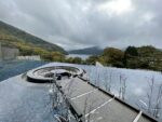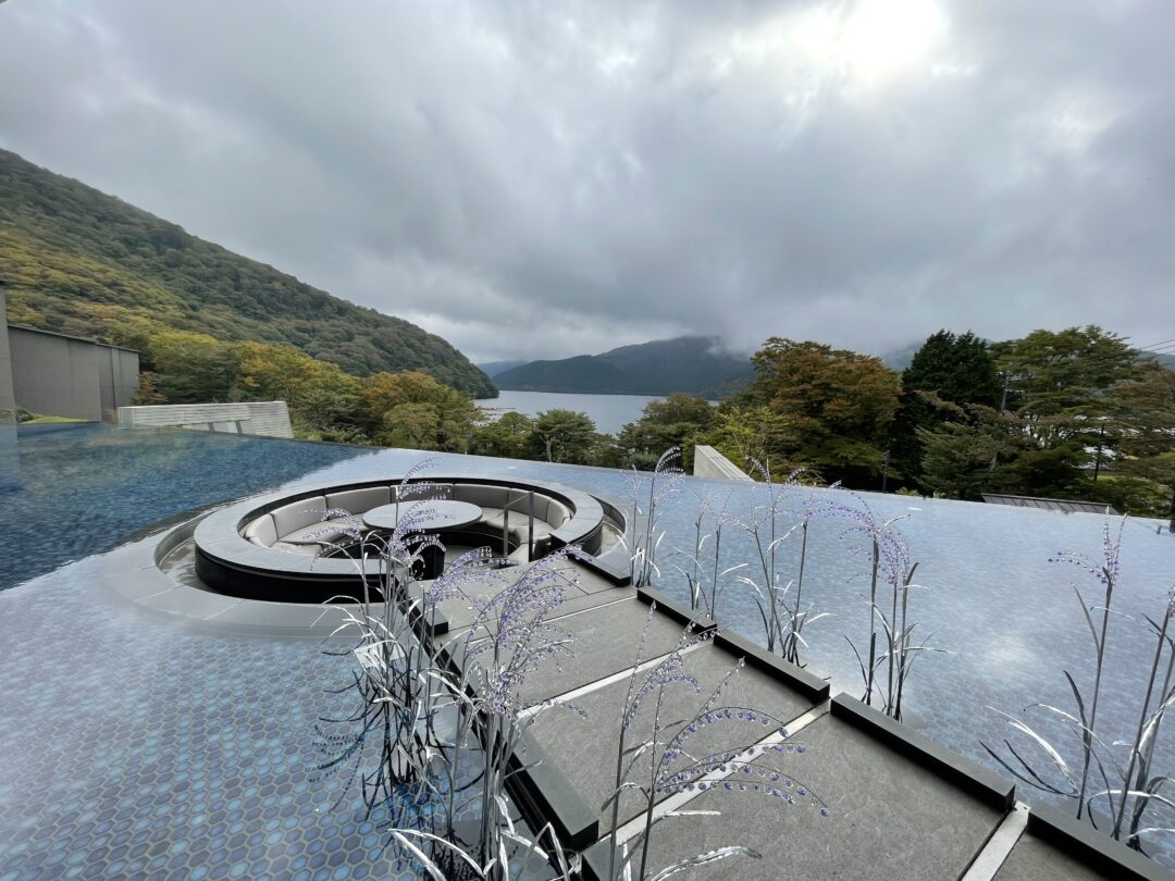 中央にソファが配置された「はなをり」自慢の水盤テラスからは芦ノ湖が一望でき、水際に立てば、水盤の水の青さ、空の青さ、芦ノ湖の青さの3つが1つになる「青い世界」が広がり、足湯カウンターではテラスの水盤越しに湖面を眺めながら、まるで芦ノ湖と一体となったような感覚を味わうことができる。