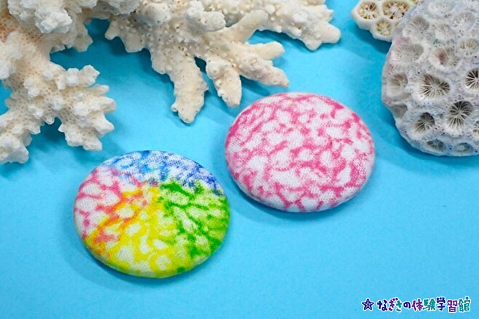 今回はキクメイシなどのサンゴの骨格を使って、サンゴ模様を写し取ったカラフルなマグネットを2つ作れるワークショップ。1つはプレゼントしたり、交換してペアで持っていてもいいかもね♡