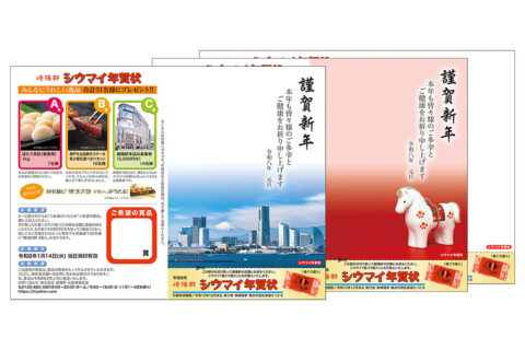 ・送る(購入された)方は、シウマイ引換券付きはがきを切り離すことで、年賀状としてご利用いただけます。切り離した残りの部分を応募はがきとして店頭にご持参もしくは、崎陽軒 広報・販売促進部 へご郵送いただくと、懸賞に応募できます。
