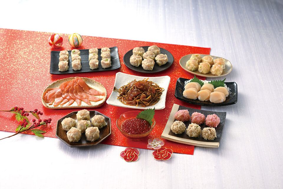 内容: 昔ながらのシウマイ 12個入×1、特製シウマイ 6個入×1、紅白もち米シウマイ 6個入×1、 えびシウマイ 6個入×1、黒豚シウマイ 6個入×1、刺身用帆立貝柱×1、いくら醤油漬け×1、 数の子松前漬け×1 、秋鮭スモークサーモン×2、オリジナル年賀カード×1 ※冷凍便