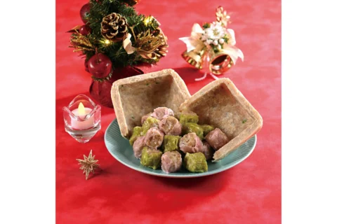崎陽軒本店のウェディングなどで人気の「ジャンボシウマイ」を家庭で楽しめるようminiサイズにアレンジした「おうちでジャンボシウマイ mini」が、華やかなシーンにぴったりなXmasバージョンで今年も登場。いつもとひと味違った演出で、Xmasや新年のパーティーを盛り上げてみてはいかが。