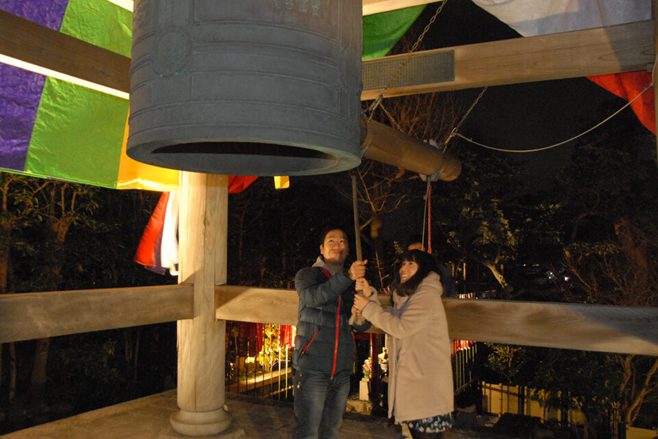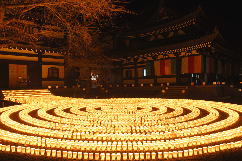 大晦日の23:00から元旦にかけては終夜山門が開かれ、年明け一番の読経の後には前年に奉納された祈願ローソク約6,000個に火が灯される万燈供養が執り行われる。(雨天、強風などの場合は、三が日のいずれかの夕刻に順延。)