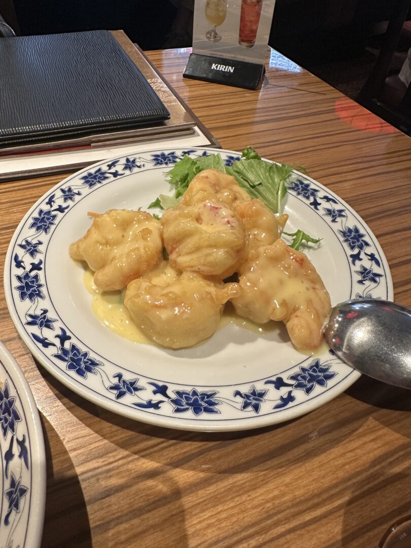 五種前菜の盛り合わせ/大海老のチリソースとマヨネーズ/冬瓜入りフカヒレの姿煮/和牛の辛しニンニク炒め/鰻入り炒飯/季節のプリン