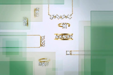 透明感溢れるクォーツを幾何学模様にあしらい、ダイヤモンドを添えて「希望の光」を表現したシリーズ。